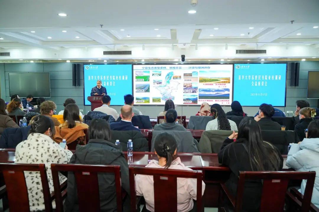 在宁夏大学,师生们学习当地历史文化,聆听专家介绍生态文明建设,开启对西部新能源发展与区域治理的实地探索。考察期间,师生们走访了共享集团、中铝银星能源、运达风电、青铜峡水电站、国家能源光伏基地及新希望夏进乳业等,深入生产一线,与企业负责人和技术人员现场交流,共同探讨因地制宜推进能源开发与生态保护的协调发展之路。在腾格里沙漠边缘,一位坚守防风治沙一线35年的专家讲述“沙漠奇迹”背后的故事,让师生们切身感受到绿色发展的艰辛与成效。在闽宁镇余隆村,师生与驻村书记深入座谈,了解当地发展经验和基层工作实践。尤为难忘的是,同学们与中宁一中的高中生们展开交流,以“哥哥姐姐”的身份分享学习心得,为他们排忧解难,鼓励年轻学子勇敢追梦。这次实践让所有人深刻体会到“知行合一”的意义,也为西部可持续发展之路注入了新的思考。